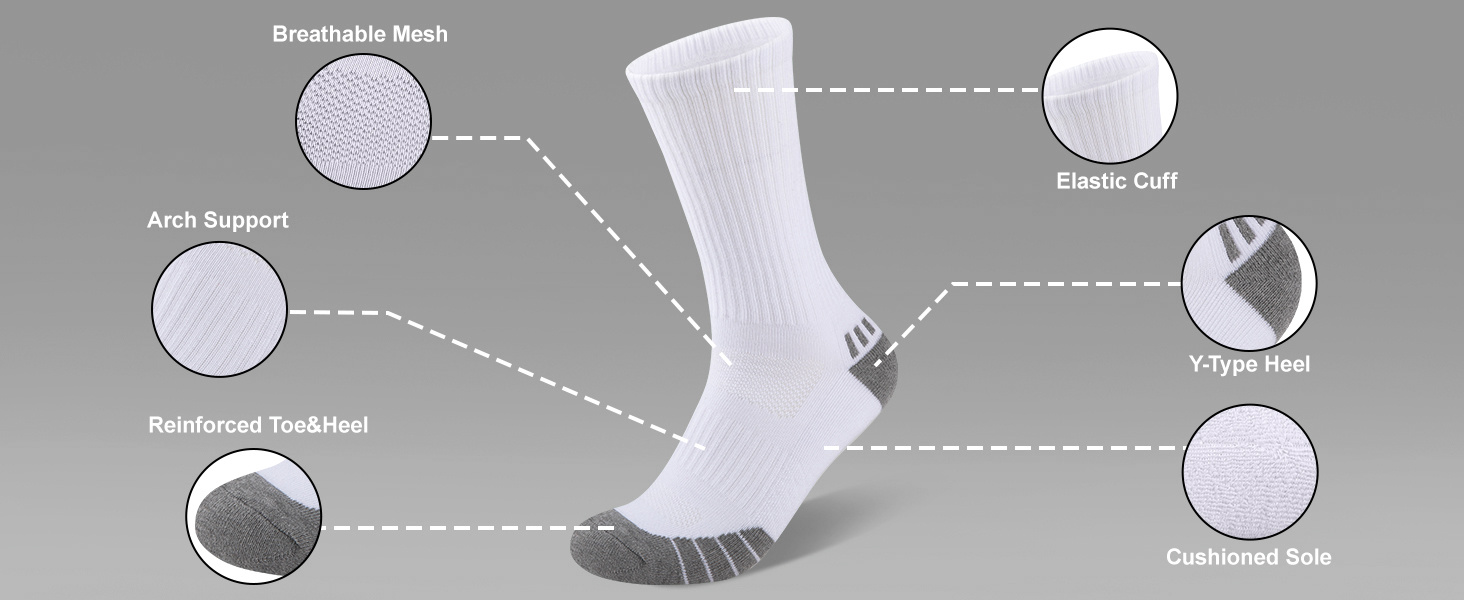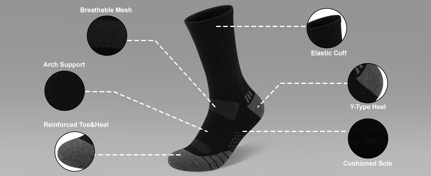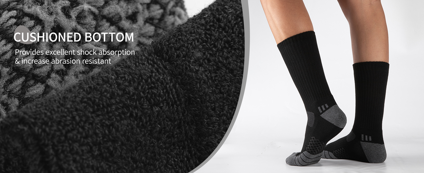 - [Thick Cushion Athletic Socks]:These mens socks crew designed with heavy cushion,which provides good cushioning and shock absorption when you are walking, running or doing other sports. It can reduce the pressure on the feet, reduce the impact of sports on the joints and bones of the feet, and protect the health of the feet.