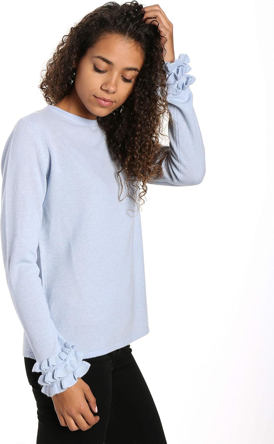 Women’s 100% Cashmere Crew Neck Sweater with Ruffle Sleeve